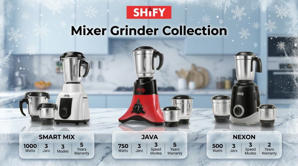 Explore the Shify Mixer Grinder Collection, built for powerful and reliable kitchen performance. Available in 500W, 750W, and 1000W variants with 100% copper motors, our mixer grinders ensure efficient grinding, blending, and mixing—making everyday cooking faster, smoother, and more convenient.