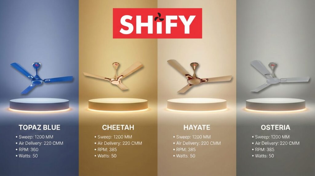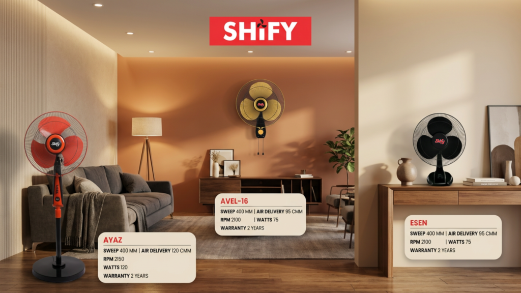 Discover the Shify Ceiling Fan Collection, featuring a wide range of stylish designer and reliable regular models. Available with advanced BLDC technology and powerful copper motors, our fans combine modern design, strong performance, and energy efficiency to keep your home cool and comfortable.